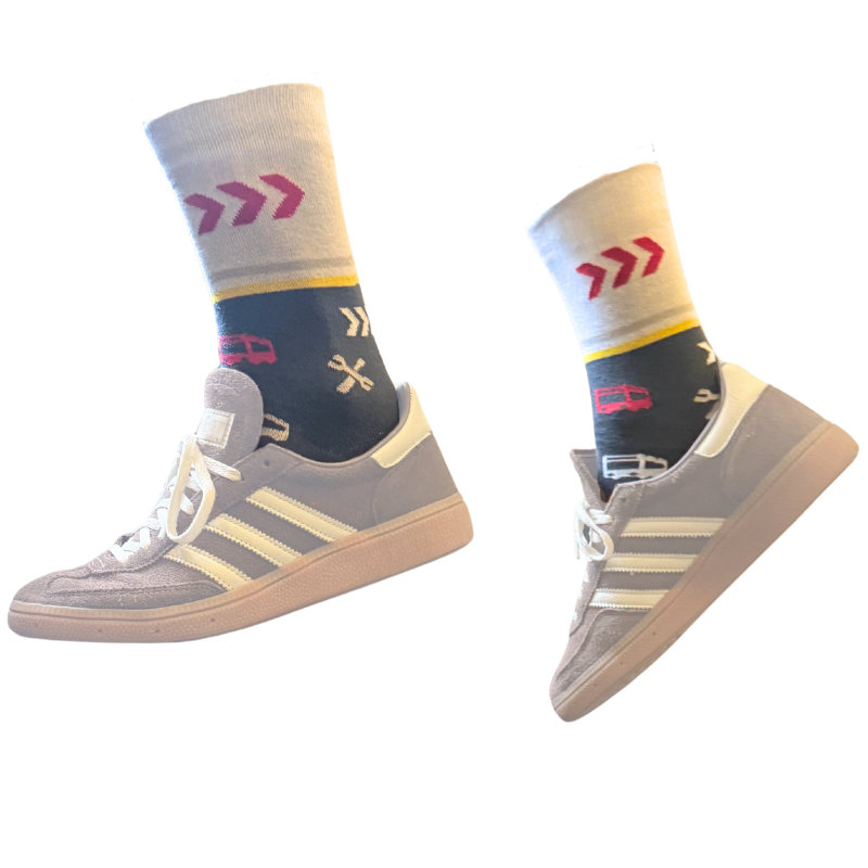 Mit den Bus-Socken von Stern & Hafferl Verkehr trägst du deine Leidenschaft für den öffentlichen Nahverkehr direkt an den Füßen. Das Design mit stilisiertem Bus-Motiv macht sie zu einem echten Hingucker für alle Busliebhaber. Die hochwertige Materialmischung aus 80 % Baumwolle, 15 % Polyamid und 5 % Elasthan sorgt für ein angenehmes Tragegefühl und eine elastische Passform. Dank des hohen Baumwollanteils sind sie weich, atmungsaktiv und angenehm zu tragen. Bitte beachten: Die Socken fallen eher klein aus – wir empfehlen, eine Nummer größer zu wählen. Perfekt für den Alltag, das Büro oder als Geschenk für alle, die gerne Bus fahren.
