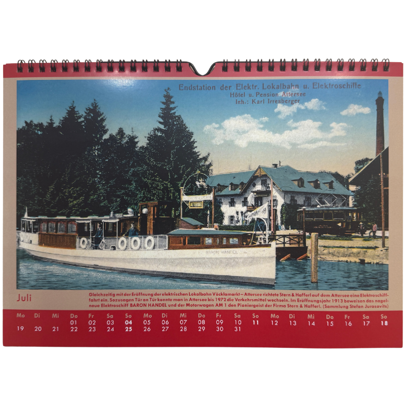 Erleben Sie das ganze Jahr über die Vergangenheit der Lokalbahn Unterach – See am Mondsee und der Attersee-Schifffahrt mit dem exklusiven „Sternstunden 2027“ Kalender. Dieser einzigartige Kalender überzeugt mit nostalgischen Charme auf zwölf liebevoll ausgewählten Fotografien. Jedes Monatsblatt präsentiert Ihnen eine perfekte Aufnahme unserer Züge und Schiffen.